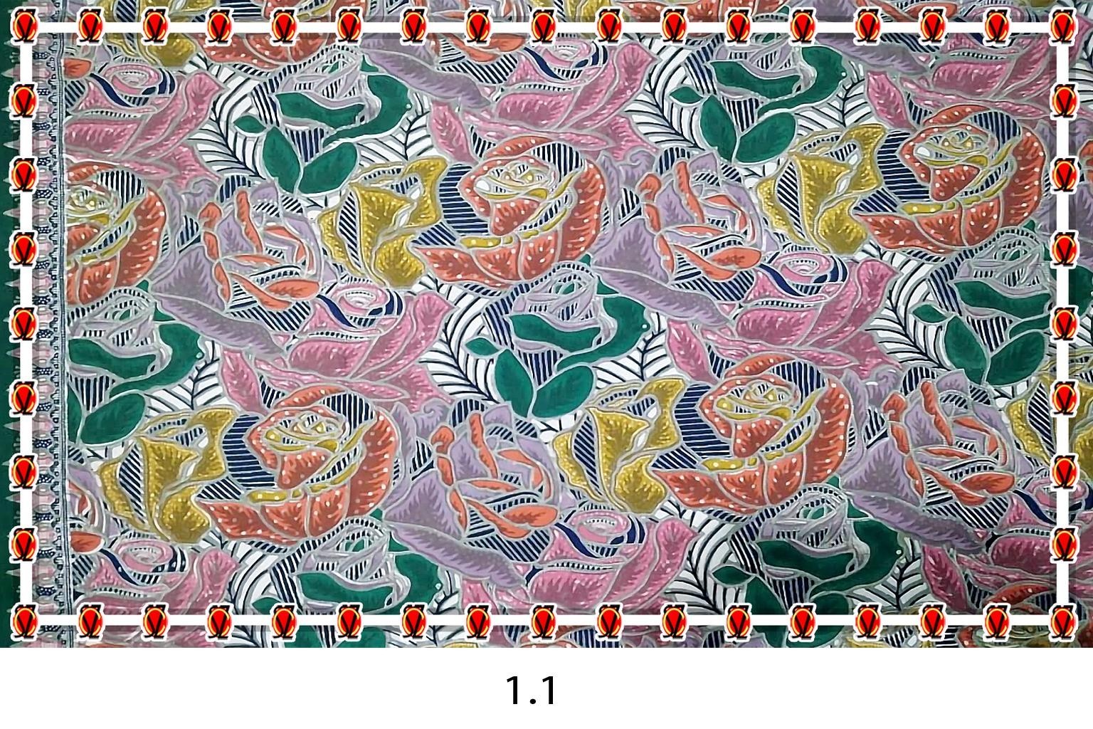 ပဟေဠိဆန်စွာဖြင့် တစ်ပွင့်နှင့် တစ်ပွင့် နွယ်ယှက်နေသော နှင်းဆီပန်းလေးများ၏ အလှကို ပေါ်လွင်အောင် တင်စား သရုပ်ဖော် ရေးဆွဲထားပါသည်။ စိမ်း နီ ဝါ ပြာ လိမ္မော် အဖြူ အနက် အရောင်စုံ သုံးစွဲ ရေးဆွဲထားပါသည်။