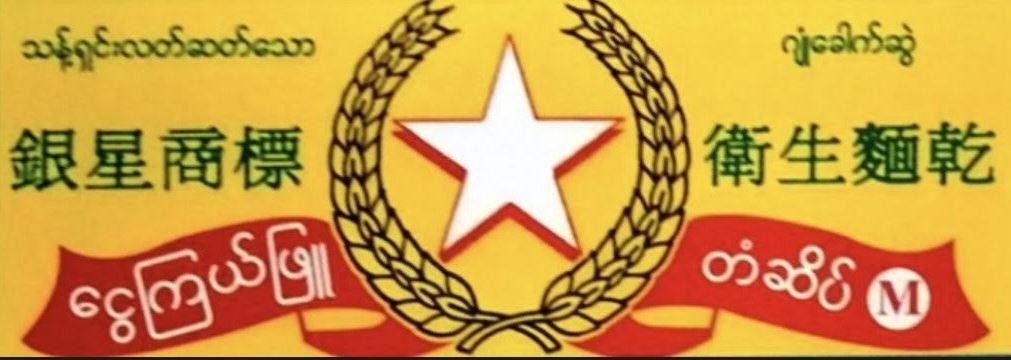 အစိမ်းရောင်၊ အဝါရောင်၊ အပြာရောင်၊ အဖြူရောင်၊ အနီရောင်။ ၁။ သန့်ရှင်းလတ်ဆတ်သော၊ ဂျုံခေါက်ဆွဲ၊ 銀星商標, 衛生麵 乾 အစိမ်းရောင်၊ ငွေကြယ်ဖြူ၊ တံဆိပ် (အဖြူရောင်) ၊ M အနီရောင်၊ Figurative ဖြစ်သည့် ကြယ်သည်အဖြူရောင်+ အနီရောင်အရိပ်၊ ဂျုံစပါးနှံသည် အဝါရောင်၊ ဖဲကြိုးသည် အနီရောင်ကို ဖော်ပြထားပါသည်။